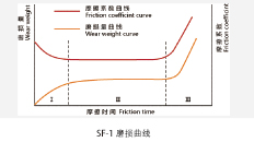 SF-40 具有优异的耐磨性,这主要是由于PTFE的特殊分子结构。SF-40磨损大致可分为三个阶段,相对应的摩擦系数亦有三种情况,见右图: